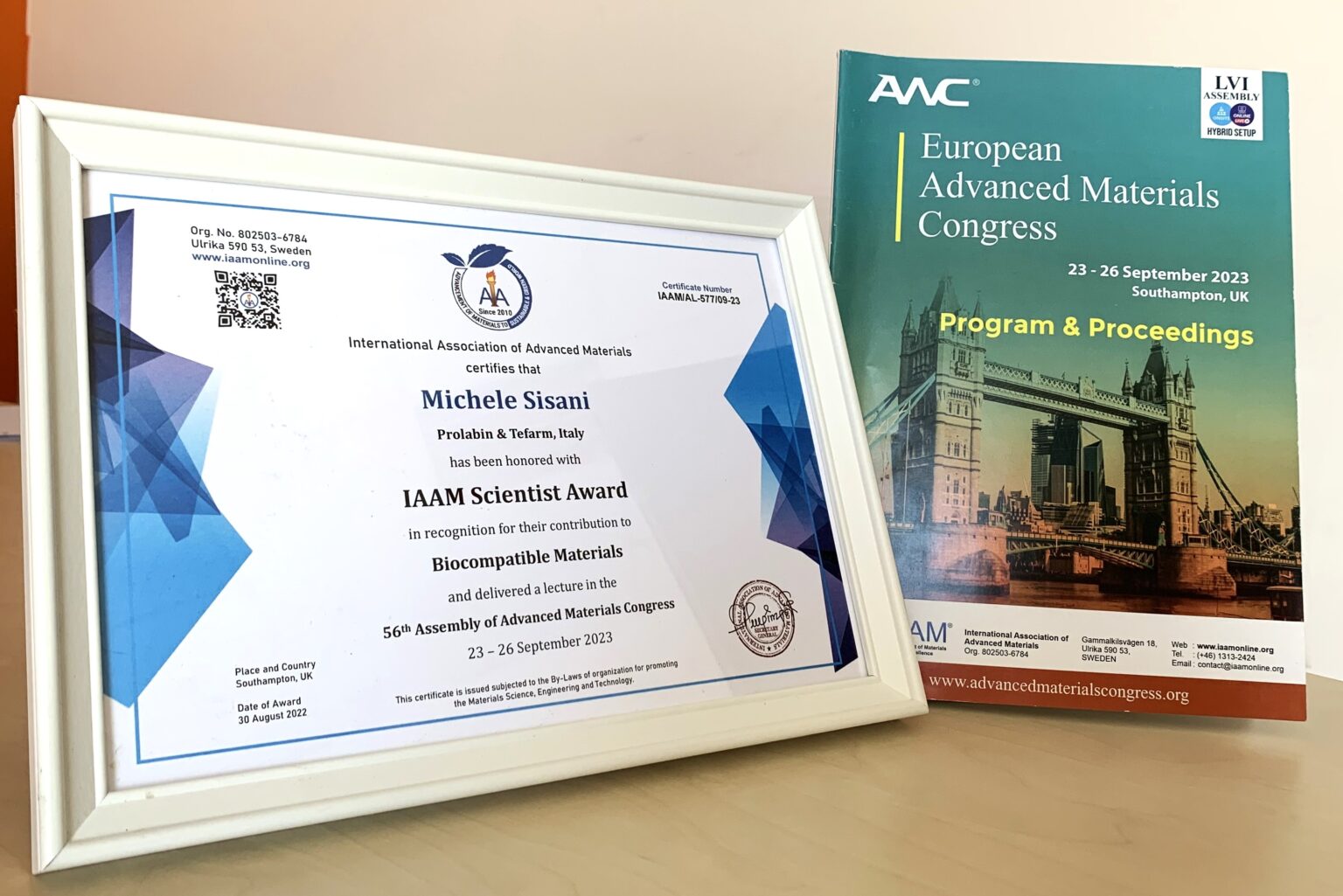 In occasione dell’EAMC, il dott. Michele Sisani ha ricevuto il premio IAAM Scientist Award in riconoscimento per i suoi contributi ai Materiali Biocompatibili e per aver tenuto una conferenza al 56° Advanced Materials Congress.